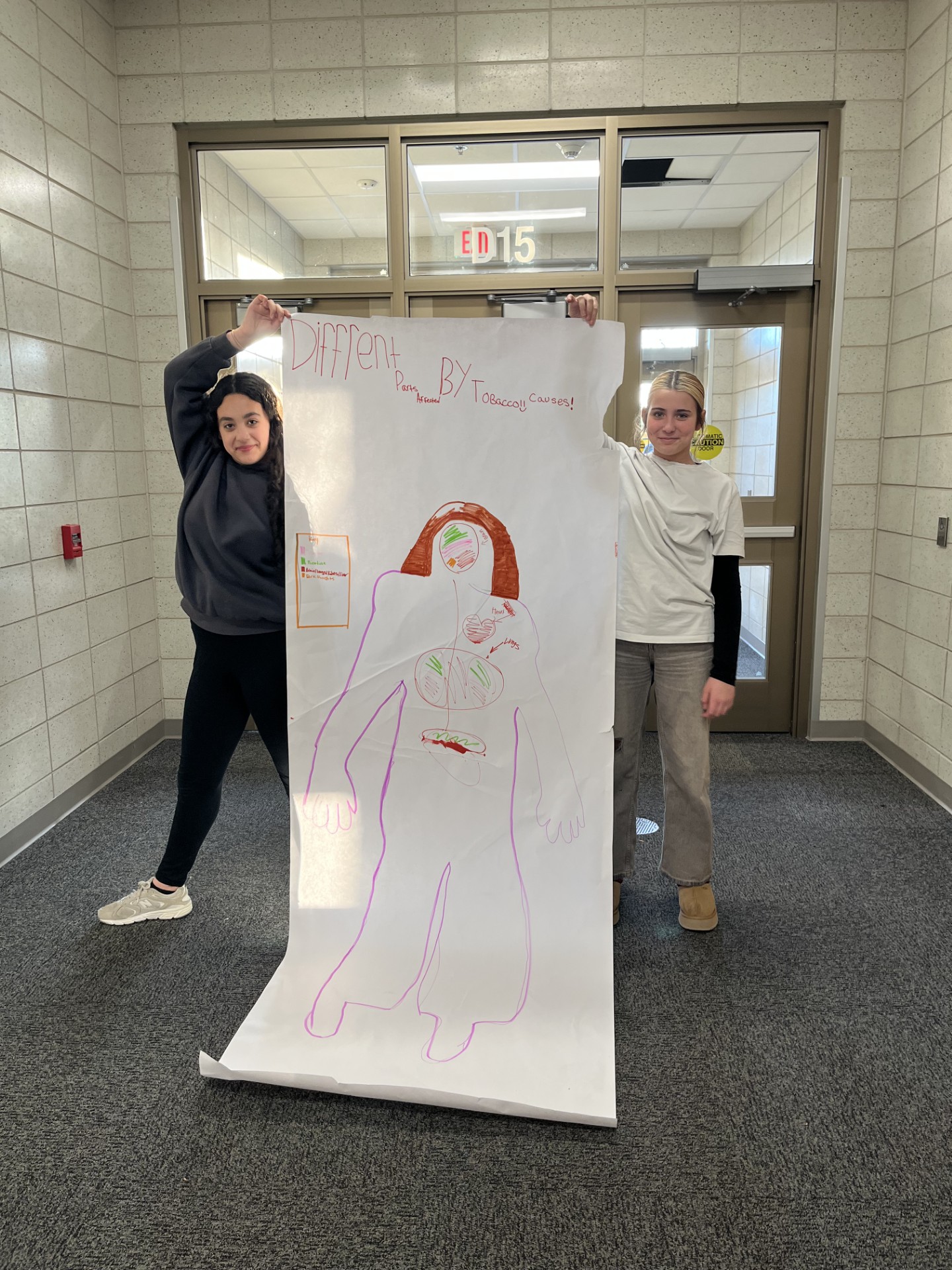 As markers filled the pages, conversations sparked about lung damage, heart disease, brain development, and the long-term consequences of nicotine addiction. The hands-on nature of the activity encouraged collaboration, creativity, and critical thinking, allowing students to visually connect health information to real-life effects. Each completed body outline told a powerful story, serving as both an educational tool and a visual reminder of the risks associated with vaping and smoking.