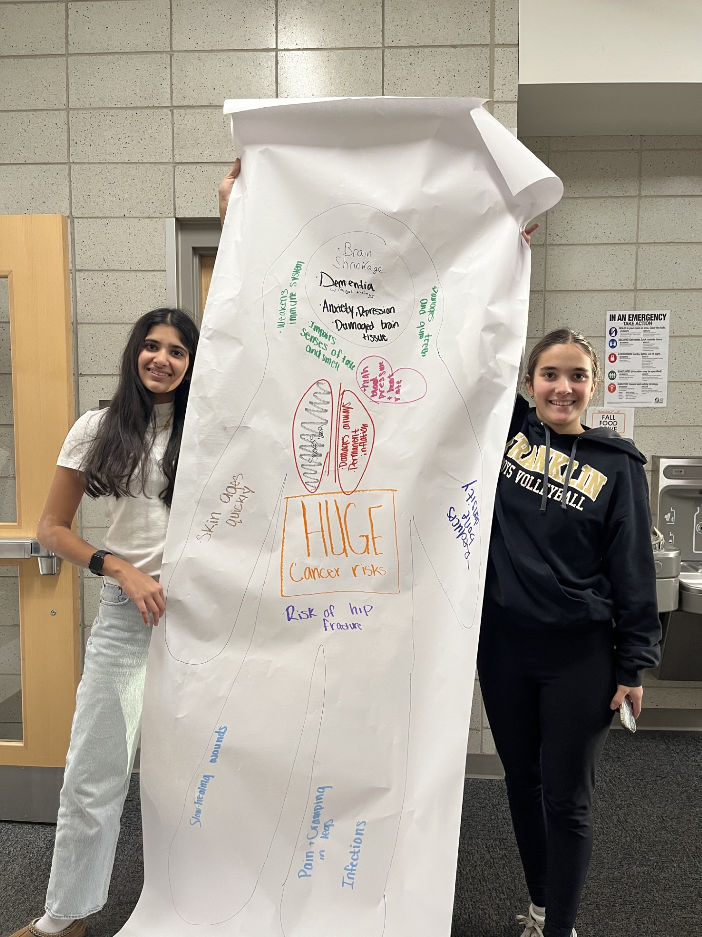 Recently, Franklin FACT members took part in an interactive and educational activity designed to deepen their understanding of how vaping and smoking affect the human body. Working in pairs, participants traced a full body outline on large sheets of paper, creating a life-sized canvas for learning and discussion. From there, students carefully drew and labeled major organs, documenting how each one is impacted by the harmful chemicals found in tobacco products and e-cigarettes.